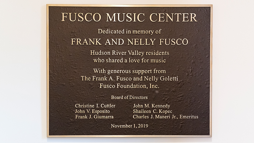 This dedication acknowledged the Frank A. Fusco and Nelly Goletti Fusco Foundation’s longstanding philanthropic leadership and commitment to Marist and its students, including a recent grant the foundation made upon its dissolution. The $2.5 million grant established the Frank A. Fusco and Nelly Goletti Fusco Music Scholarship—the largest endowed scholarship in the College’s history.