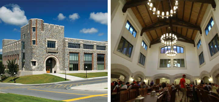 The new building connects seamlessly with the renovated Student Center, the centerpiece of which is a grand dining hall built around a former exterior courtyard, which was enclosed with a cathedral ceiling and features three, brass, custom-made chandeliers. The dining hall also includes a quiet dining area that can be used for group meals, and a patio for al fresco dining. Elsewhere in the Student Center, the Nelly Goletti Theatre and student activity spaces were all extensively renovated, and new activity spaces were added. The buildings began opening in phases, starting in August 2013, and were fully operational by November 2013.