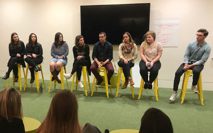 Eight Marist alumni currently work at IPG MediaBrands. The group held a Question and Answer session with current Marist students as part of the Career Trek. East Coast CEO Kris Mangel also held an information with students who attended the event at the agency’s headquarters. He outlined the agency’s structure and gave his thoughts on the state of the advertising industry. The Career Trek included a session led by IPG MediaBrands Talent Acquisition Partner Sean Ahearn ’14, who discussed the application process for jobs and the agency’s summer internship program. Students also took a tour of the five-story office building.