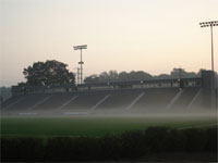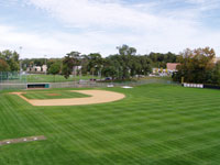 The natural turf field, irrigated by 53 sprinkler heads, is composed of a bluegrass, rye and fescue mix and is rooted in a sand base. This sand base, along with the installed drain tile, provides superior drainage thus allowing very few Red Fox games to become rain-outs.