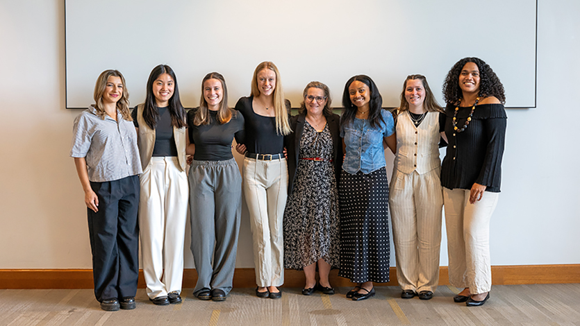 The 2024 Marie and Rupert Tarver Summer Interns present a summary of their work. From Left to right: Angel Fauerbach ’25, Ting Fischer ’25, Veronica Vogelman ’26, Maggie Hartman ’25, Dr. Melissa Gaeke, Director of the Center for Civic Engagement and Leadership, Charshell Lipai ’25, Molly Harnaga ’25, and Paschalyn Cama ’25. Photo by Benson Delaney '27/Marist University.