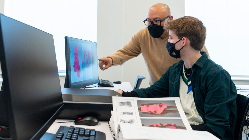 Professional Lecturer of Fashion Design Richelle Valenzuela (standing) providing Mark Bissell (seated) with CLO3D design feedback.