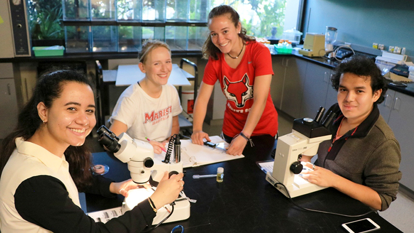 This year, Marist students also had the opportunity to conduct a related scientific study. Specifically, the students set out to examine changes in glass eel weight, length, and pigmentation throughout the season. Twice a week, the team collected 20 glass eels from NYSDEC sampling nets, brought them back to the lab at Marist, and carefully measured their weights, lengths, and levels of pigmentation. Their study offers clues about how and when eels develop within the estuary, as well as providing information of interest to the Atlantic States Marine Fisheries Commission, an interstate body that coordinates the conservation and management of 27 nearshore fish species. The Marist students who conducted the specialized research were Rodina Abdelhady ’21, a biomedical sciences major from Wappingers Falls, New York; and environmental science and policy majors Jeramie Glynn ’20 of Summit, Pennsylvania; Kathryn Samarro ’21 of Wyckoff, New Jersey; Bridget Connolly ’20 of Rumson, New Jersey; and Clairice Drexler ’20 of Southington, Connecticut.