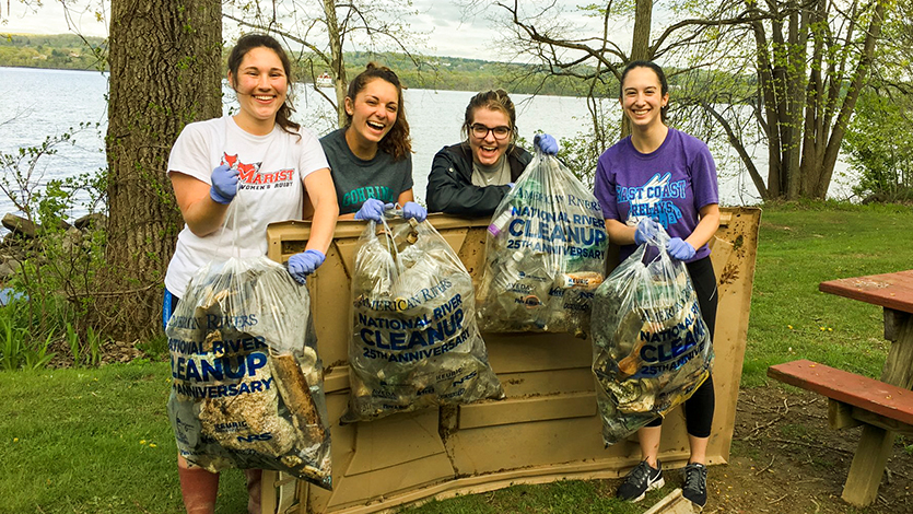 Senior Lecturer of Biology Amy Cahill has also gotten Marist students involved in protecting the local environment. Most recently, they volunteered to support the efforts of Riverkeeper, a community organization dedicated to protecting the environmental, recreational, and commercial integrity of the Hudson River and its tributaries. On May 4, Cahill led 13 Marist students in the 8th Annual Riverkeeper Sweep cleanup event in Esopus. The students picked up 139 plastic bottles, 141 bottle caps, and more than 300 pieces of foam, glass, and plastic. Says Cahill, “This was my fifth year involving students as co-leaders/volunteers at this event to clean up parks along the Hudson River. A really nice aspect of this project is that our students worked side by side with residents of the local community. And for the past two years, we’ve recorded data on what we collect for a wider study with Riverkeeper.”