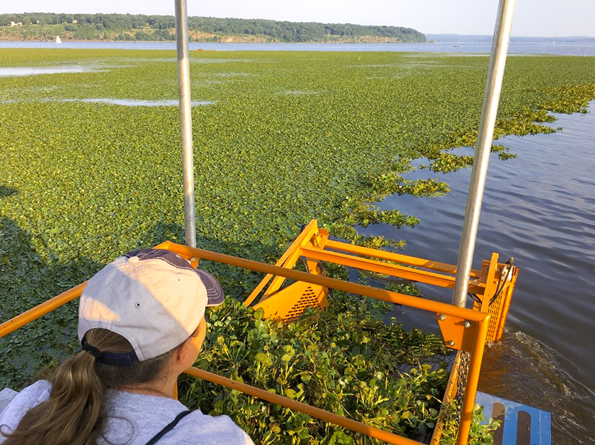 Earlier in the 2018-19 academic year, Cahill spearheaded another project in which Marist students volunteered to remove water chestnuts from the Hudson River. Along with Cahill, biomedical sciences majors Meaghan Ranalli ’22 of Fishkill, New York and Ovie Obaro ’19 of Kingston, New York manned a water chestnut harvesting boat to assist with the management of this invasive species. Water chestnuts are a significant environmental nuisance because they form nearly impenetrable floating mats of vegetation. The mats are hazardous for boaters and can severely limit light penetration into the water and negatively impact the growth of native aquatic plants beneath the canopy. The reduced plant growth, combined with the decomposition of the water chestnut plants, can result in reduced levels of dissolved oxygen in the water, impact other aquatic organisms, and potentially lead to fish kills. Looking ahead, Cahill has been granted a sabbatical for the spring 2020 semester, and she plans to involve Marist students in a study of invasive species management strategies in the Hudson Valley.