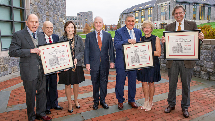 October 30, 2019—President Dennis Murray presented Marist College’s President’s Award for Community Service to the Frank A. Fusco and Nelly Goletti Fusco Foundation, Alexander Reese, and Robert and Kathleen Finn at the College’s 52nd annual Community Breakfast today in the Murray Student Center Cabaret on campus.