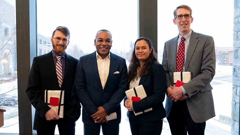 (L-R) Andrew Zink '19, Alvin Patrick '86, Sage Kawelo '19, and John Ansley at the opening reception for the library exhibition "Black Lit."