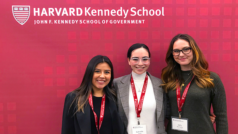 February 19, 2019—Active participation in the electoral process is the lifeblood of any democracy, and three Marist students recently had the chance to explore this theme in depth at Harvard’s Institute of Politics (IOP), part of the Kennedy School of Government. Political science majors Julia McCarthy ’19, Pamela Armas, ’20, and Gabrielle Salko ’21 traveled to Cambridge to participate in IOP’s 2019 National Campaign for Political and Civic Engagement Conference. The students were accompanied by Melissa Gaeke, Director of Marist’s Center for Civic Engagement and Leadership, and Jessica Boscarino, Associate Professor of Political Science. The conference took place the weekend of February 8-10 and included students, faculty, and administrators from more than 35 colleges and universities. Its purpose was to learn about student-led civic engagement efforts on campuses across the country and to take those lessons and begin to set action plans to increase student engagement in voting initiatives and other civic activities.