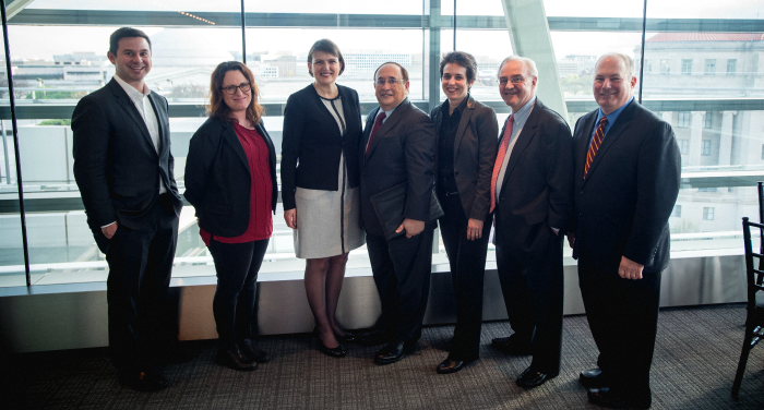 At Washington, D.C.'s Newseum for the "Changing America" panel were, from left to right, Mark Murray of NBC News, Maggie Haberman of The New York Times, Marist Poll Director Barbara Carvalho, MIPO Director Lee Miringoff, Amy Walter of The Cook Political Report, E.J. Dionne, Jr. of the Brookings Institution and The Washington Post, and President David Yellen.