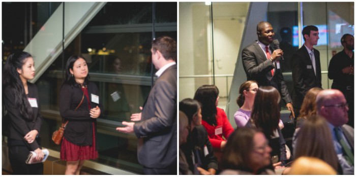 Marist College students Dori-Lei Chee '18 and Naomi Ko '17 speak with NBC News Senior Political Reporter Mark Murray, left; Ifedapo Benjamin '17 asks a question of the panel, right.