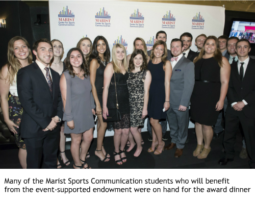 The event was attended and sponsored by many friends of the college as well as other top organizations in the sports and media industry. Event sponsors include the NBA; ESPN; Bond, Schoeneck & King Attorneys; 1-800-Flowers.com; The Pike Company, Daniel O'Connell's Sons Construction; Agua Brands; J.W. Hulme Co.; William Gottlieb Real Estate; The James J. McCann Charitable Trust; Apple Montessori Schools; BSN Sports; Hickey-Finn & Company, Inc.; JTR Transportation; and the Marist Red Fox Club. Proceeds from the event will support the Center for Sports Communication's endowment, which provides much-needed shcolarships, cutting-edge research, and student programming throughout the year.