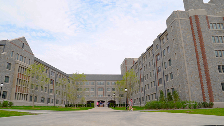 Designed by Robert A.M. Stern Architects, Tom and Mary Ward Hall marks the northern portal of the campus. At 116,879 square feet, it is the largest residence hall in the North Campus Housing Complex. The complex carries forward Marist’s architectural palette of granite stone, limestone, and red brick. The architects were inspired by the three historic buildings remaining from the original estate that became Marist College.