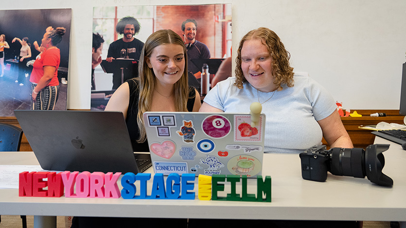 Grace Rowan ’23 (left) and Samantha Piroh ’23 (right) doing behind the scenes work inside the Murray Student Center during New York Stage and Film’s Summer Season at Marist. Photo by Nelson Echeverria/Marist University.