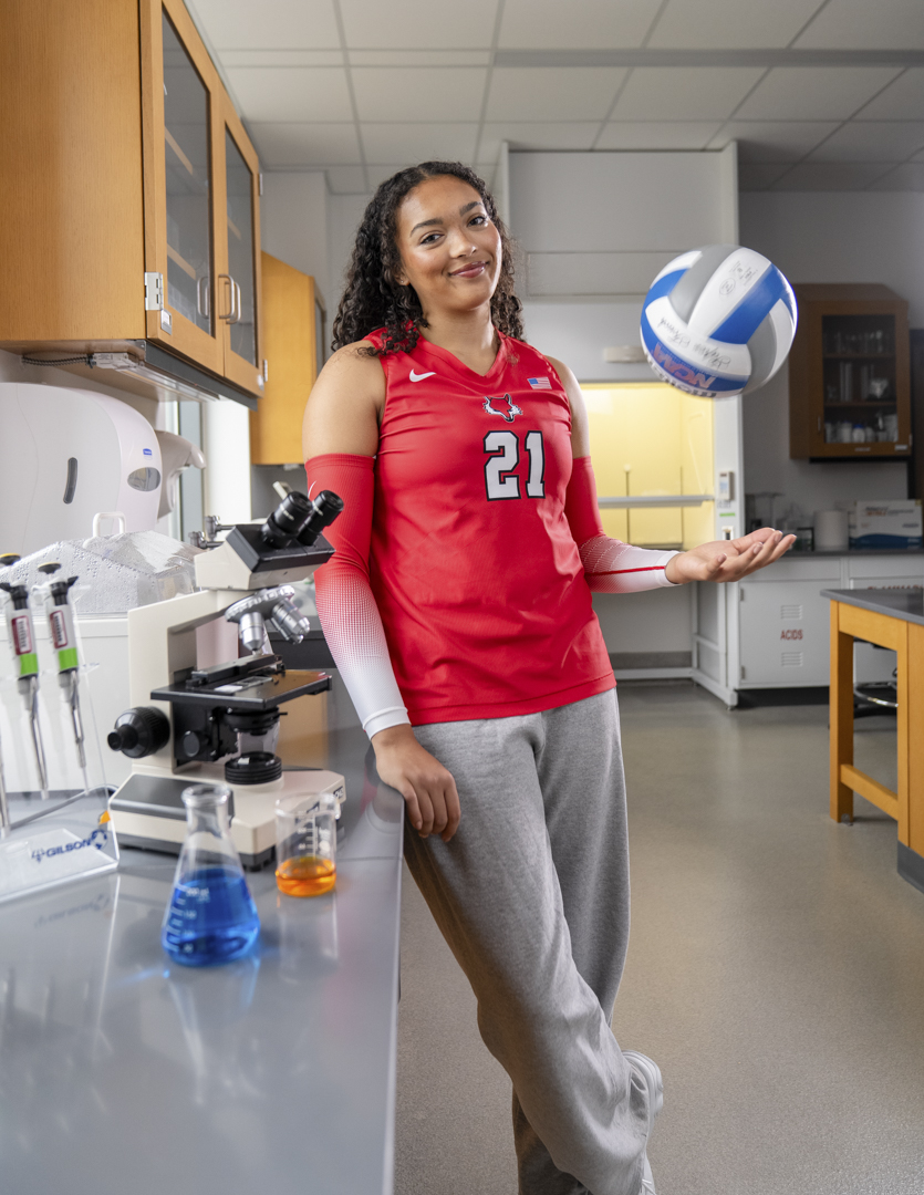 From Marist Magazine — When Vallane Sneva ’27 arrives for morning lab, the DI student-athlete is often still in her volleyball warm-up jacket from practice. But within minutes, she’s balancing chemical equations with the same persistence and focus she brings to the court. It’s a rhythm she’s mastered at Marist—moving between identities, responsibilities, and passions without ever feeling like she must choose only one.