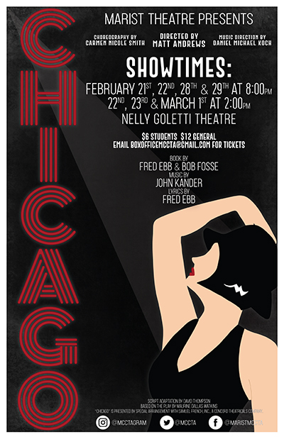 * Performance dates for Chicago span two weekends: February 21, 22, 28, and 29 at 8:00pm and February 22, 23, and March 1 at 2:00 in the Nelly Goletti Theatre. As always, Marist faculty and staff receive two complimentary tickets and advance reservations are highly recommended. Complimentary reservations for faculty and staff can be made by emailing boxofficemccta@gmail.com. Simply identify yourself as faculty/staff with date, time and number of tickets requested and you will receive a confirmation email. Additional tickets are $12 general admission and $6 students/seniors/military. Your tickets will be at the door 90 minutes before curtain and the house opens 30 minutes before curtain. Seating is general, first come-first seated. Chicago is recommended for ages 13 and older, and no children under 6 will be admitted.
