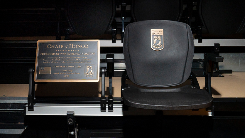 November 30, 2022 – Marist College is deeply committed to the veteran community and honoring those who served for their service and sacrifice, including those who have not been able to come home. On November 27, Marist College unveiled the “Chair of Honor” inside McCann Arena, a tribute to Prisoners of War and those Missing in Action.